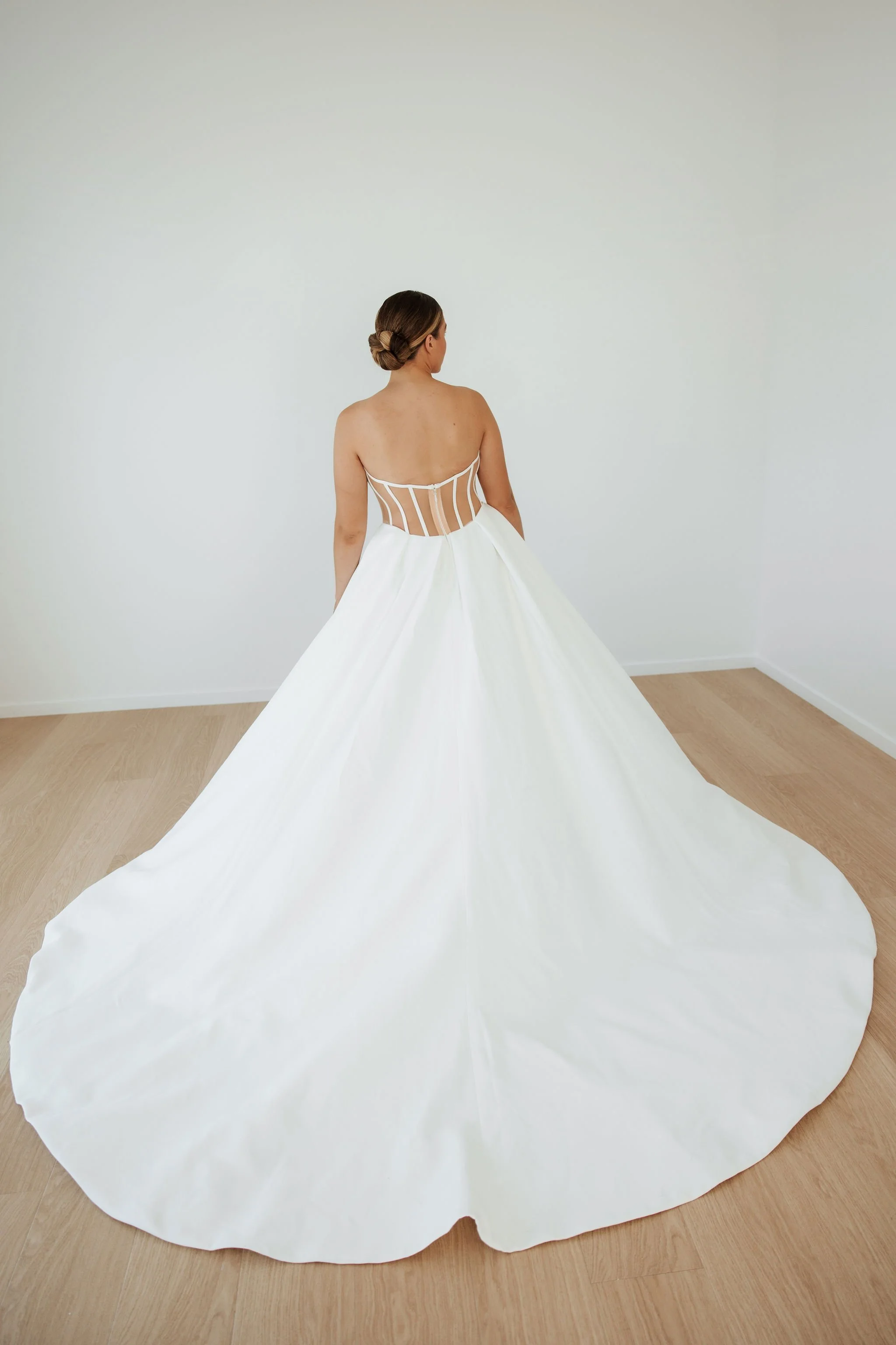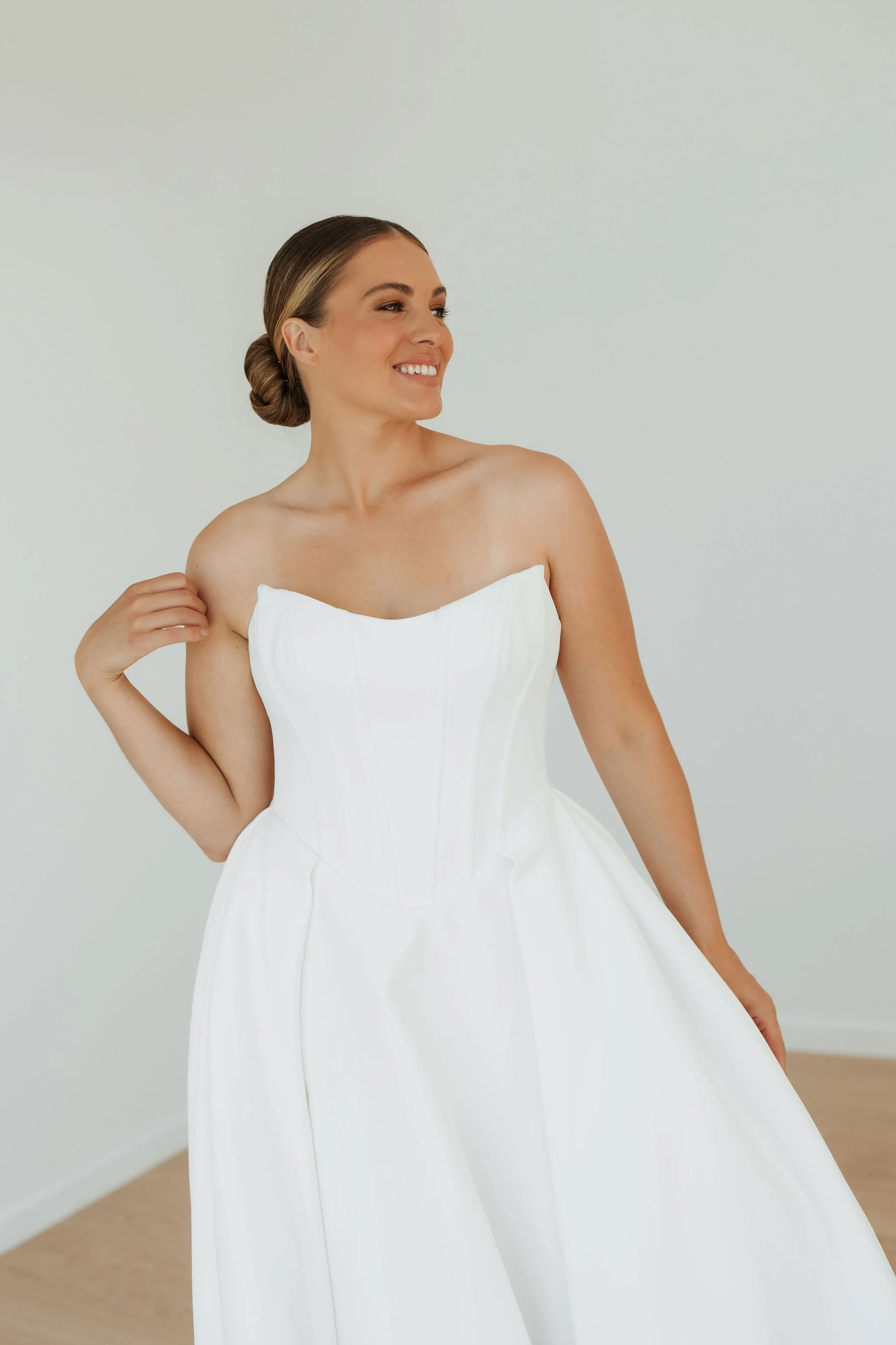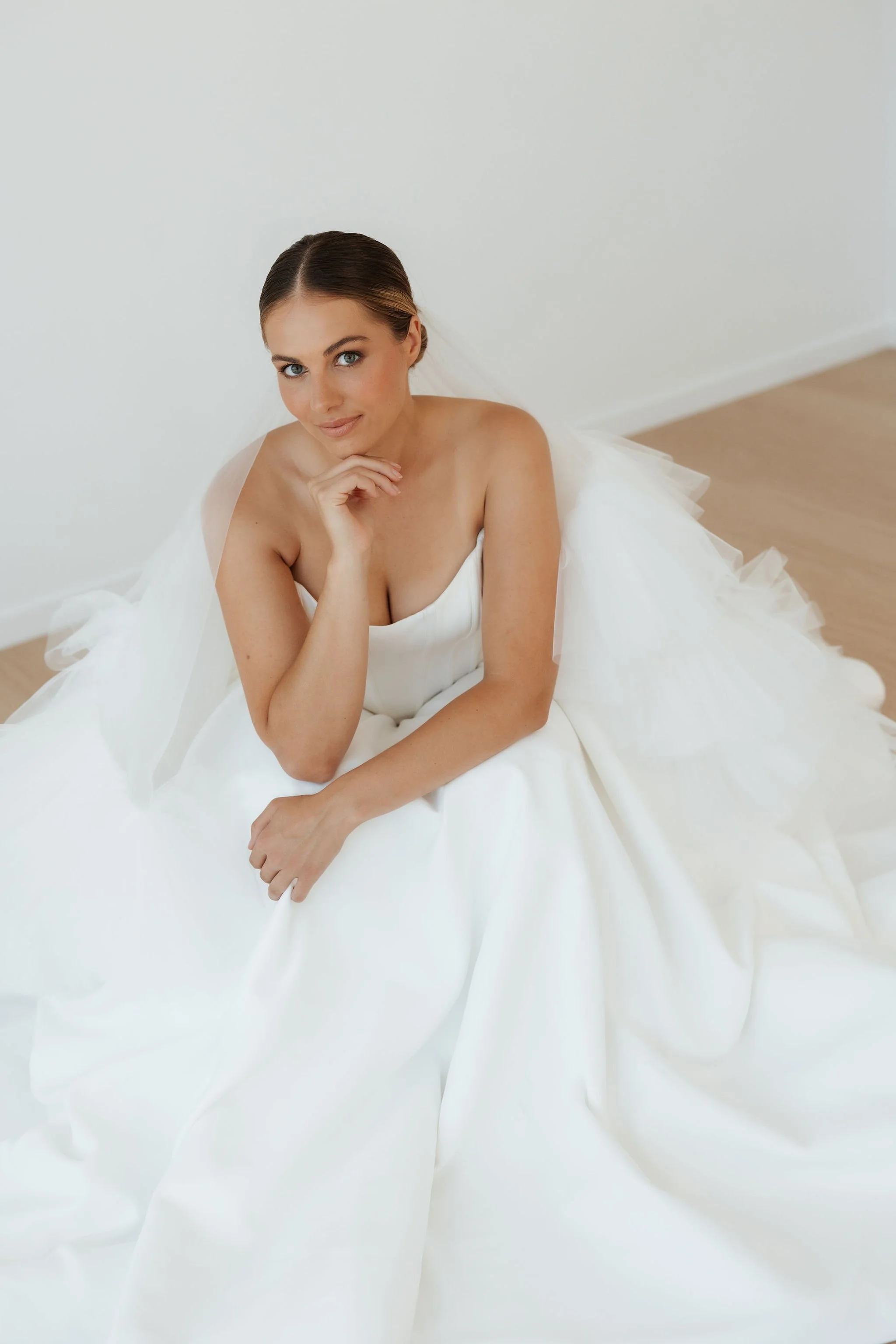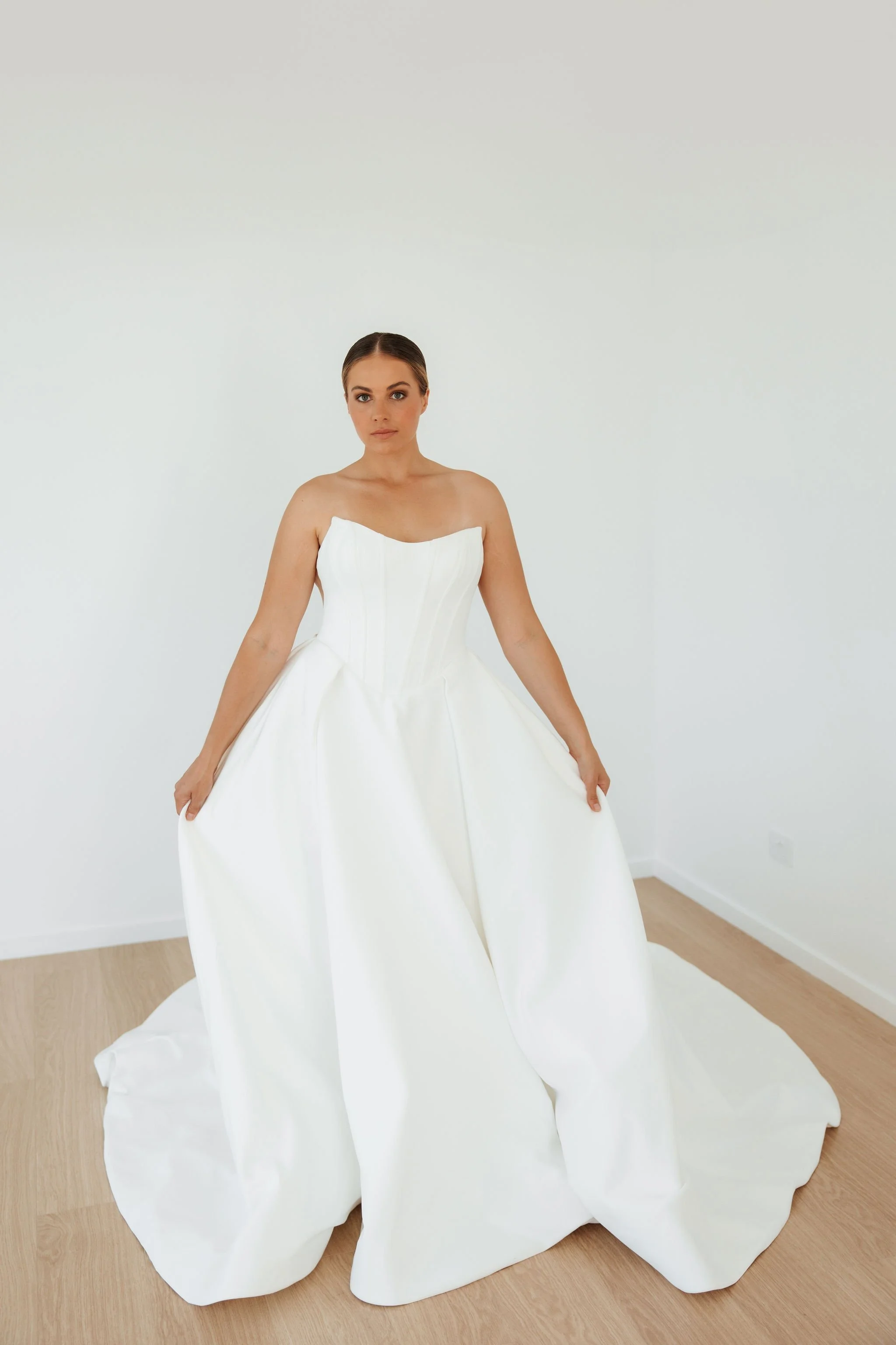 With clean lines, subtle sophistication, and a minimalist approach that lets the beauty of the bride shine through.