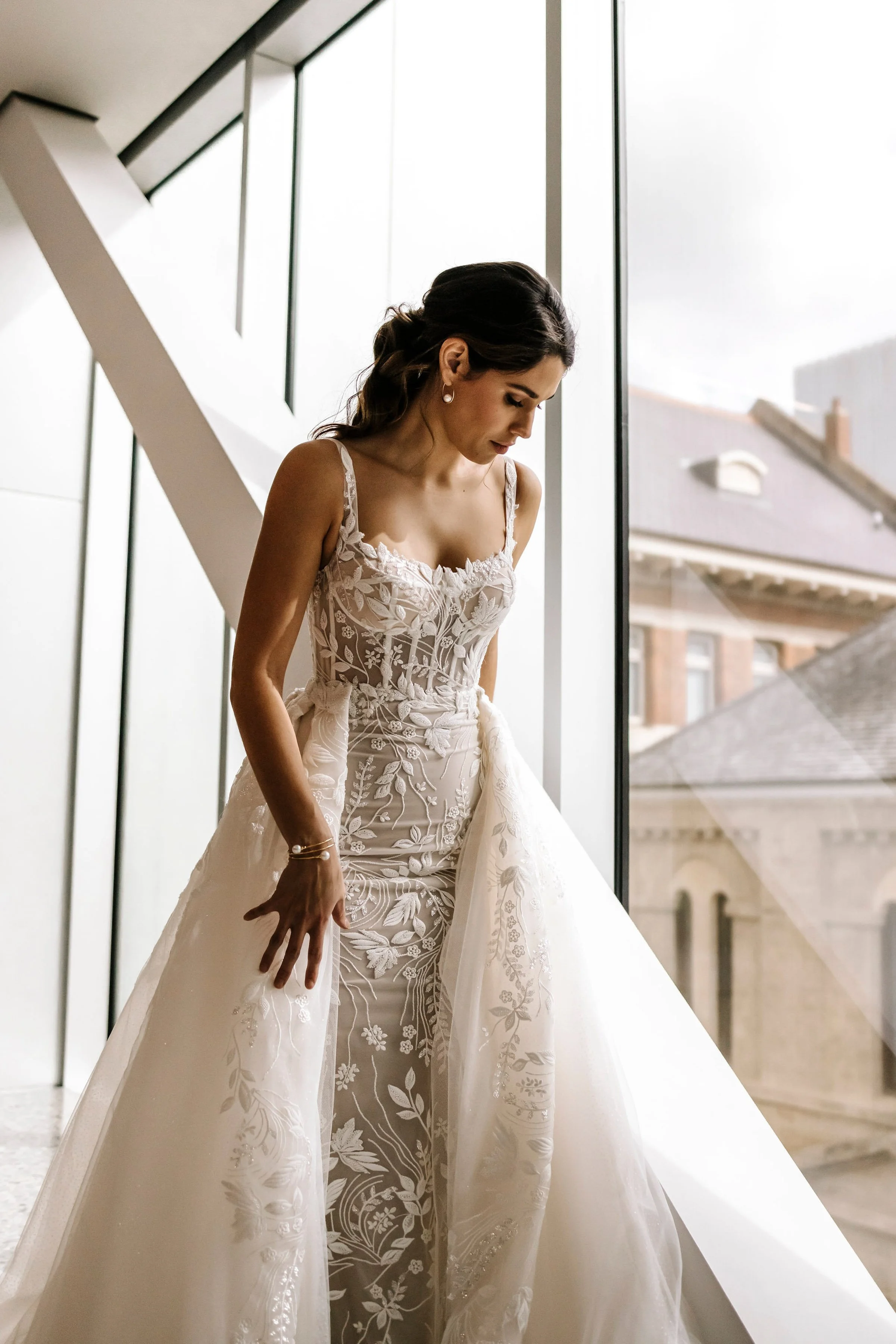 What sets this gown apart is the detachable overskirt, a versatile addition that allows brides to transition seamlessly from a dramatic aisle presence to a more streamlined look for the reception. It’s the perfect blend of functionality and couture craftsmanship.